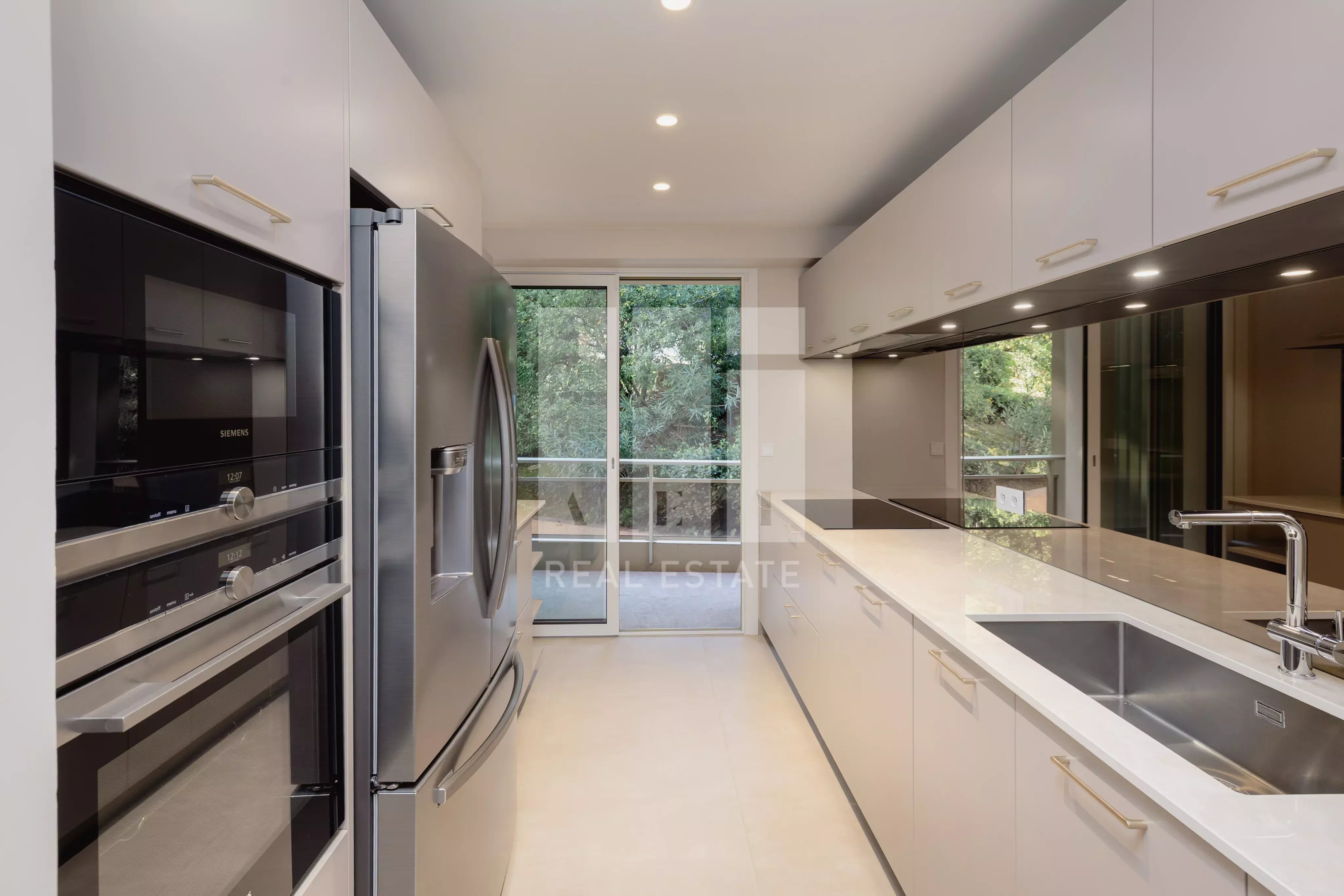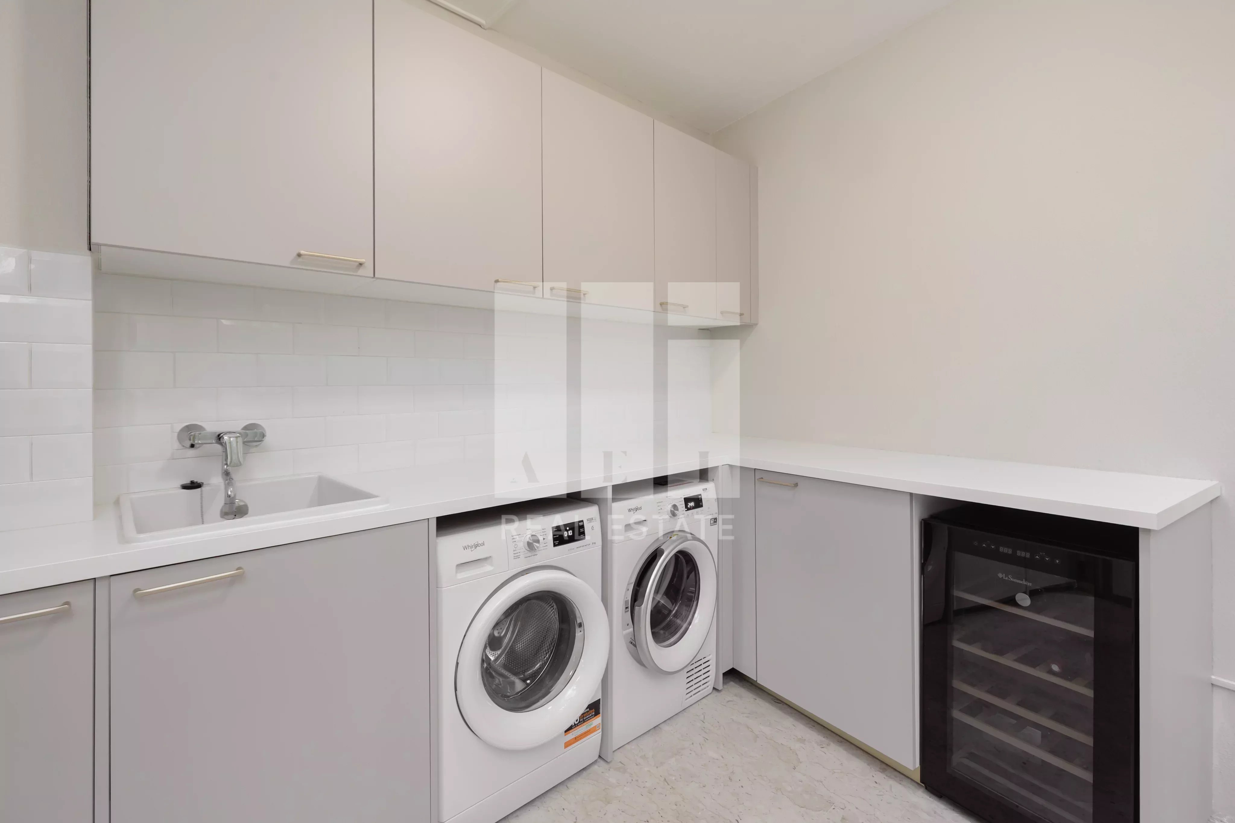 La cuisine moderne entièrement équipée est complétée par une spacieuse buanderie avec accès à un balcon.